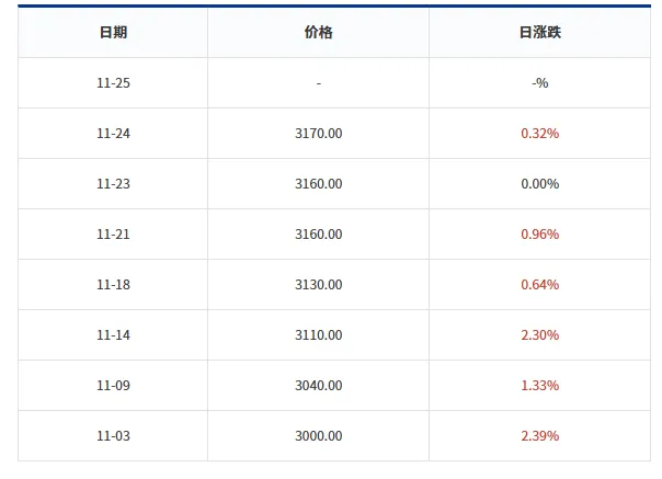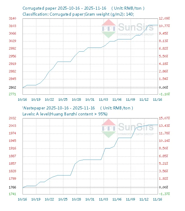 V prípade vlnitého papiera s gramážou 140 g/m² sa ceny medzi 16. októbrom a 16. novembrom 2025 zvýšili o 12,09 %. Počas dlhšieho obdobia (27. augusta až 25. novembra) dosiahli kumulatívne zisky 20,99 %. Do 24. novembra najnovšia cena dosiahla 3170 RMB za tonu, pričom pokračovali malé úpravy smerom nahor.